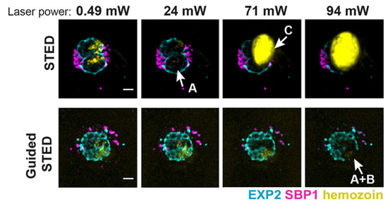 The development of STED microscopy has provided new chances for studying plasmodium falciparum in blood, which is the most deadly of the human malaria parasites [83,84]. Schloetel and coworkers invented guided STED [85], a new STED microscopy based on adaptive illumination, to image the whole life cycle of plasmodium with an unprecedented 35 nm resolution without destroying any surrounding cellular structures (Figure 4). Compared to RESCue STED and DyMIN STED, guided STED uses the reflection signal from hemozoin particles, which are highly reflective and insoluble crystals produced when parasites digest hemoglobin, to identify the most photosensitive regions of the sample. When hemozoin particles are presented in the cell, guided STED can effectively help researchers explore the state of the parasites.