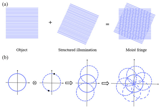 Schematic diagram of SIM principle: (a) generation of moiré fringes; (b) implementation of two-dimensional spatial frequency expansion.