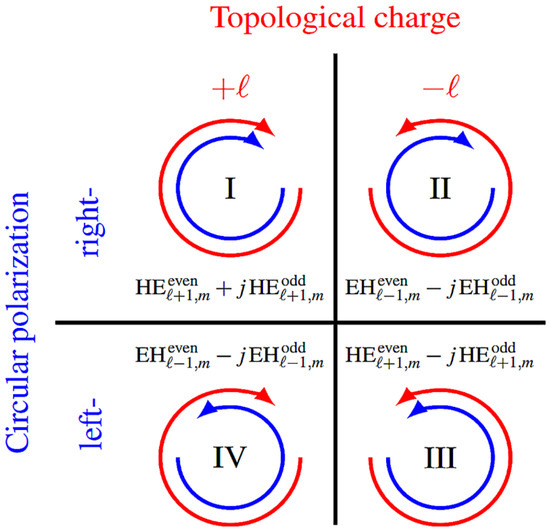 where the superscript “±” indicates the right or left direction of the circular polarization, the subscript “±” indicates the right or left rotation direction of the helical phase wavefront, and the superscripts “even” and “odd” indicate the even and odd modes derived by linear superposition. The circular polarization direction of is the same as the wavefront rotation, but the polarization direction of is opposite to the wavefront rotation [23,24]. The OAM beam has four representations when |l|>1, due to the varied orientations of circular polarization and spiral phase wavefront rotation, as shown in Figure 1, and the specific formula is presented in Equation (1).