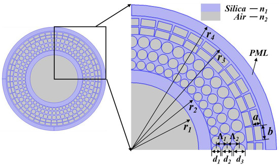 Figure 2 shows the cross-section of the SC-PCF structure. The gray area describes the air holes and the blue area represents silica. r1 represents the radius of the fiber core, r2 represents the inner diameter of the annular structure, r4 represents the radius of SC-PCF, and the difference between r3 and r4 represents the thickness of the perfect match layer (PML), which can be used to simulate the absorption conditions at the boundary and calculate the transmission characteristics of the PCF. The diameters of the circular air holes on the three layers are d1, d2 and d3, respectively. The length and width of the square air holes on the two outermost layers are a and b, and the spacing of the adjacent air holes is Λ. When designing a PCF, the number and transmission properties of OAM modes are affected by the size and number of air holes in the cladding. After numerical analysis, the optimal parameters were determined as shown in Table 2.