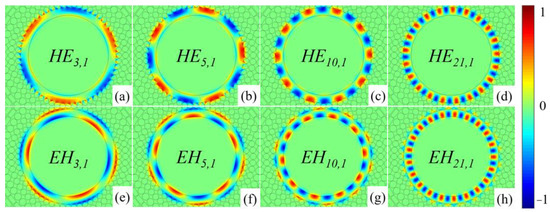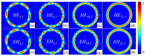 Electric field intensity distribution diagram: (a) HE3,1, (b) HE5,1, (c) HE10,1, (d) HE21,1, (e) EH3,1, (f) EH5,1, (g) EH10,1, (h) EH21,1.