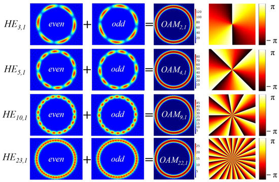 Referring to Equation (1), OAM mode can be synthesized by the superposition of the odd mode and even mode of HE mode and EH mode. Figure 5 shows the synthesis process and phase diagram of OAM4,1, OAM6,1, OAM11,1, OAM22,1 modes. The phase change of OAM mode is 2πl with the increase in topological charge number, as shown in the figure [15]. As a result, the topological charge number of the OAM mode may be clearly determined from its phase diagram.