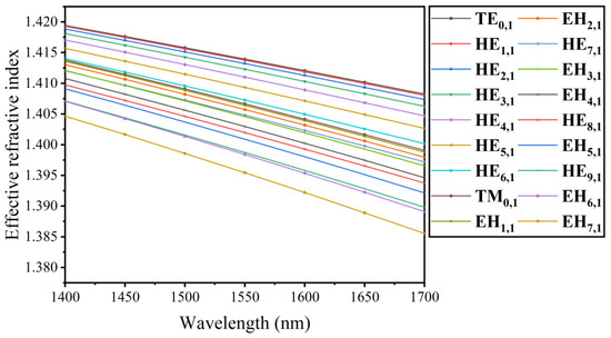 Figure 6 shows the relationship between wavelength and the ERI in the wavelength range from 1400 nm to 1700 nm. The ERI decreases gradually with increasing wavelength. Meanwhile, the ERI will decrease faster with the increase in mode order, which is caused by the diffusion of the optical field into the cladding.