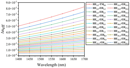 Figure 7 shows the ERID between modes supported by SC-PCF. The figure shows that the ERID increases gradually as the wavelength increases, and that the greater the order, the lower the ERID. Furthermore, all ERIDs are greater than 1 × 10−4. At the wavelength of 1550 nm, the ERID between HE3,1 and EH1,1 is as high as 5.88 × 10−3, which is much larger than the recently published reference [21]. The large ERID indicates that the fiber has great mode separation characteristics, which is of great research value in multi-channel fiber communication systems. To avoid coupling between adjacent modes, the ERID should be greater than 1 × 10−4. The ERID can be expressed by the following equation [34]: