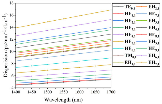 The dispersion of SC-PCF is shown in Figure 8. In the range from 1400 nm to 1700 nm, the dispersion of the higher-order mode increases with the increase in wavelength, whereas that of lower-order modes increases more flatly with the increase in wavelength, which is connected to the change in ERI with wavelength. The EH mode has a higher dispersion than the HE mode. In addition, the dispersion increases as the mode order increases, so the higher-order mode will cause pulse broadening, leading to the instability of the mode transmission. The minimum dispersion changes by 0.956 ps/nm/km, indicating that the dispersion changes of various modes are relatively stable. The dispersion changes of HE1,1, HE2,1, HE3,1, and HE4,1 modes are 0.973 ps/nm/km, 1.024 ps/nm/km, 1.108 ps/nm/km, and 1.228 ps/nm/km, which are far lower than the minimum dispersion value in the recently proposed reference [18,30,35]. At the wavelength of 1550 nm, the lowest dispersion is only 4.939 ps/nm/km, and the overall dispersion is less than 71.6 ps/nm/km. The dispersion is relatively flat, which is conducive to the transmission of OAM mode in the fiber.