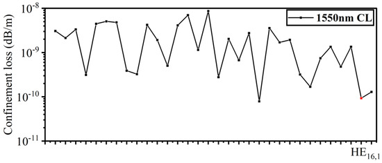 Figure 9 shows the CL distribution of different modes in the range of 1550 nm. It can be seen that the fluctuation of each mode is obvious without uniform regularity, but the overall loss is confined to the order of 10−8 dB/m–10−11 dB/m, showing a relatively low CL. This is caused mainly by the high refractive index ring and the layer-by-layer amplification of the air hole structure. At the wavelength of 1550 nm, the CL of EH16,1 mode is the lowest, which is 1.55 × 10−11 dB/m, as low as the lower-order mode of a similar structure [11,12,14]; the CL of EH3,1 mode is 3.13 × 10−10 dB/m, lower than the existing PCFs [35].