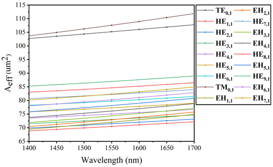Figure 10 shows the relationship between Aeff and wavelength. It can be seen from the figure that Aeff tends to rise with the increase in wavelength. Through analysis of dispersion and CL, it indicates that the larger the wavelength, the weaker the limiting ability of the light field, and the energy of the fiber core leaks into the cladding gradually, leading to energy divergence, and Aeff increases gradually. It can be seen from Figure 10 that the relationship between Aeff and wavelength changes linearly. In the range from 1400 nm to 1700 nm, the overall distribution of Aeff is from 60 μm2 to 110 μm2. At the wavelength of 1550 nm, the TM0,1 mode has the largest Aeff of 107.57 μm2, higher than the current PCFs [31,35,37].