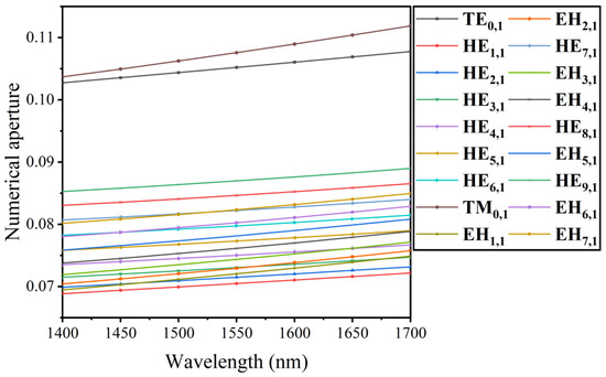 Referring to Equation (7), NA can be increased by increasing the wavelength and decreasing Aeff. Figure 11 shows the changing relationship between wavelength and NA. The NA at 1550 nm is lower than 0.11, and the low NA is conducive to its application in the field of coherent layer analysis and imaging [38].