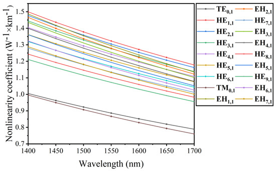 Figure 12 shows the relationship between wavelength and NC. In the range from 1400 nm to 1700 nm, the overall NC is less than 1.5 W−1·km−1, showing extremely low NC, especially at 1700 nm; the lowest NC in TM0,1 mode is 0.789 W−1·km−1. Optical communication mainly works in the C-band around 1550 nm, where the minimum NC of TM0,1 mode is 0.867 W−1·km−1, which is 0.1 W−1·km−1 to 2 W−1·km−1 lower than the PCF structures proposed in recent years [18,21,35]. It is more conducive to the stable transmission of OAM mode in the optical fiber and has broad application prospects. For example, in optical fiber communication, suitable nonlinearity can be obtained by designing photonic crystal fibers with special structures, which can be used to make optical fiber communication devices, such as Raman fiber amplifiers, optical parametric amplifiers, etc. [39,40,41]; in optical soliton research, optical fibers can be used with nonlinear effects in the design of pulse compression or all-optical switches [42,43].