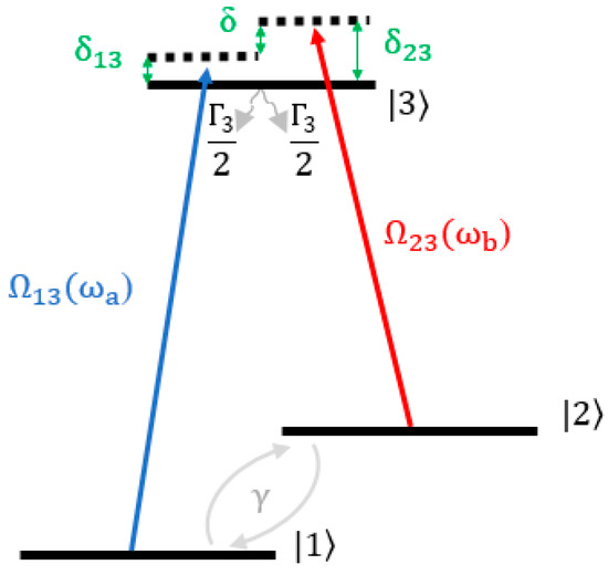 A typical system for CPT interrogation is shown in Figure 1. The atoms are evenly distributed in the ground states and , and the bichromatic laser (with angular frequency and ) interacts with atoms. The frequency detuning between the ground states and , and the excited states is defined as and , respectively, where and are the frequency splitting between the ground states and and the excited states , respectively, and the Raman detuning is defined as . The Rabi frequency for the transition with electric dipole moment is defined as , where is the electric field amplitude. is the spontaneous decay rate of the excited state , and γ is the relaxation rate of the coherence between the hyperfine ground states.