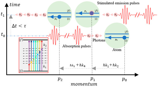 We introduced a stimulated emission scheme for the two-photon cooling method by pulses, as shown in Figure 2. A train of pulses generated by ML laser propagating toward the right side interact with the atoms moving to the left side. In momentum–time space, the atoms initially locate at (P0, t0) with momentum p0 toward the left side, and after they absorb TPs with wave vectors and coming from the left side, the atoms go to the final state from the initial state directly through the process of DTPT while losing the momentum of ℏ . Since the excited atoms do not absorb resonantly, their return to the ground state without the spontaneous emission needed for further absorption can only occur by stimulated emission [39,40]. If the stimulated emission is caused by a counter-propagating pulse toward the left side, the excited atoms at (P1, t1) would lose another momentum of ℏ ; hence, the total momentum lost is ℏ . These stimulated processes repeat at the Rabi frequency that is much larger than the decay rate . Because the excited atoms return to their ground states more frequently during the stimulated emission process rather than during the spontaneous emission process, the pressure radiation force from photons will not be in a saturated state at a momentum exchange rate limited by .