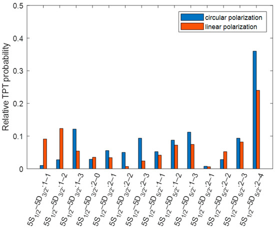 Relative probabilities of 87Rb 5S-5D two-photon transitions, where blue represents excitation with circularly polarized photons and red represents excitation with linearly polarized photons.
