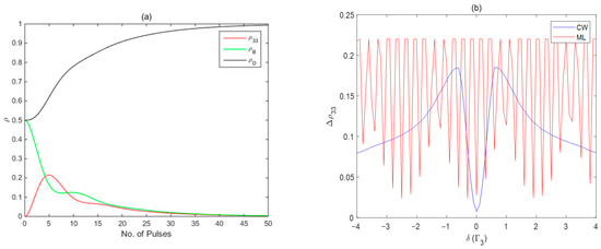 Figure 6 illustrates the results of these pulses interacting with the same sample of cold 87Rb atoms to interrogate the CPT signals based on the configuration in Figure 1. For both cases, the Doppler shifts are assumed to be 0.01. In the calculation, we used 500 Gaussian pulses to simulate the optical combs, the pulse–atom interaction is described by the Bloch equations as in Ref. [47], and the temporal evolution of the elements of the atomic density matrix can be numerically resolved by using the fourth-order Runge–Kutta method. The Rabi frequency is defined as , for ML, , the pulse width is 1 ps, and the pulse repetition period is 10 ns. For cw, the Rabi frequency is ; ; and for the 87Rb atom . We assumed under the initial condition to obtain the results shown in Figure 6a. The red, green, and black lines in the figure represent the population of excited state, bright state, and dark state changing with the number of pulses, respectively, where the bright state and dark state are defined as respectively. From Figure 6a, we can see that the bright and dark states are at 50% each in the beginning. When the atoms interact with about 40–50 pulses, the bright state (green line) is slowly pumped to the dark state (black line), while the atomic excited state (red line) population slowly becomes 0, the atoms have minimum fluorescence, which is in the dark state, and the CPT phenomenon occurs. We denote the difference from the maximum value of to the value at the end of 50th pulse as . The change in the population of excited states during this process corresponds to the process of the fluorescence changing from bright to dark.