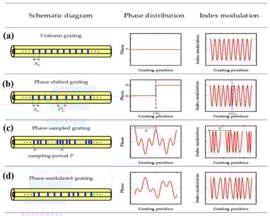 Fiber grating refers to a piece of fiber where there exists a periodic index modulation in either the core or the cladding region along the fiber axis direction. Since 1978, when Hill et al., first invented the fiber grating [1], countless kinds of fiber gratings have been proposed and demonstrated to date, which, however, can mainly be divided into two categories: fiber Bragg gratings (FBGs) and long-period fiber gratings (LPGs) [1,2,3,4,5,6,7,8,9,10,11,12,13,14,15,16,17,18,19,20,21,22,23,24,25,26,27,28,29,30,31,32,33,34,35,36,37,38,39,40,41,42,43,44,45,46,47,48,49,50,51,52,53,54,55,56,57,58,59,60,61,62,63,64,65,66,67,68,69,70,71,72,73,74,75,76,77,78,79,80,81,82,83,84,85,86,87,88,89,90,91,92,93,94,95,96,97,98,99,100,101,102,103,104,105,106,107,108,109,110,111,112,113,114,115,116,117,118,119,120,121,122,123,124,125,126,127,128,129,130,131,132,133,134,135,136,137,138,139,140,141,142,143,144,145,146,147,148,149,150,151,152,153,154,155,156,157,158,159,160,161,162,163,164,165,166,167,168,169,170,171,172,173,174,175,176,177,178,179,180,181,182,183,184], of which the phase-inserted fiber gratings (PI-FGs), including the phase-inserted FBGs and the phase-inserted LPGs, refer to the gratings where there exist a single or a large number of the phase-shifts among the local sections (or periods) of the gratings. All the PI-FGs proposed and demonstrated to date can mainly be divided into three categories, i.e., the phase-shifted fiber gratings [6,7,8,9,10,11,12,13,14,15,16,17,18,19,20,21,22,23,24,25,26,27,28,29,30,31,32,33,34,35,36,37,38,39,40,41,42,43,44,45,46,47,48,49,50,51,52,53,54,55,56,57,58,59,60,61,62,63,64,65,66,67,68,69,70,71,72,73,74,75,76,77,78,79,80,81,82,83,84,85,86,87,88,89,90,91,92,93,94,95,96,97,98,99,100,101,102,137,138,139,140,141,142,143,144,145,146,147,148,149,150,151,152,153,154,155,156,157,158,159,160,161,162,163,164,165,166,167,168,169,170,171,172,173,174], the phase-only sampled fiber gratings [104,105,106,107,108,109,110,111,112,113,114,115,116,117,118,119,120,121,122,123,124,125,126,175,176,177,178], and the phase-modulated fiber gratings [127,128,129,130,131,132,133,134,135,180,181,182,183,184]. For an intuitive view, the structure diagrams, phase distributions, and index modulations of both the uniform grating and the PI-FGs are schematically depicted in Figure 1, respectively, where Figure 1a corresponds to case of a uniform fiber grating. As is shown, in this case the index modulation distribution is of a cosine-like one with a period of Λ0, while the local phases remain a constant through whole length of the grating. Figure 1b corresponds to the case of a phase-shifted fiber grating, where there exist one or several phase jumps in the phase distribution of the grating itself. Such a phase jump is also called the phase-shift, which in general can be equivalently realized by inserting an additional blank region Dφ in the distribution of index modulation, as shown in Figure 1b. Figure 1c shows the case of a phase-only sampled fiber grating, where the local phase of the grating is modulated by a periodic function, generally called the phase-only sampling function, and the period of such a phase function is much larger than that of grating itself. The phases of the sampling function could be discrete or continuous ones, and the continuous one can be discretely divided and coded into each local period of the seed grating. The phase-only sampled fiber grating is commonly used to generate multiple channels in the spectrum. Figure 1d corresponds to the case of a phase-modulated fiber grating, where the local phase of the grating is not a periodic one but an either linear or nonlinear function of the grating’s position z. The most typical example of such kinds of gratings could be the linearly chirped FBG, where linear change of the period in terms of the position in fact can be equivalently expressed as the FBG’s local phase but with a quadratic relation with the position z [5]. Similarly, phase distributions of such gratings could be either discrete or continuous ones, and in fabrication, the continuous phase can be discretely divided and encoded into each local period of grating itself.