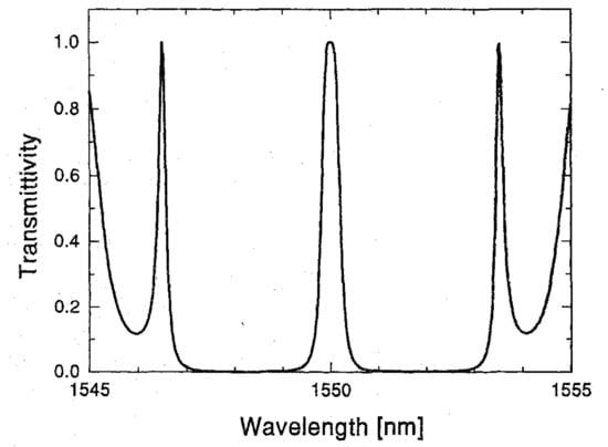 where and N represent the magnitude and number of inserted phases in the grating, respectively. represents a step function, i.e., when and when . Once if the phase-shift and other parameters including the maximum index modulation, the grating period, local phases, and total length of the FBG are determined, the reflection/transmission spectrum of the PS-FBG can be calculated by using the transfer matrix method [5]. Figure 2 shows the transmission spectrum of one typical PS-FBG, where a π phase-shift is inserted at the middle of a uniform FBG [7]. From this figure, it can be seen that due to the insertion of the π phase-shift, the loss band of the original FBG (i.e., the FBG without phase-shift) is split into two, and accordingly in the transmission, an ultra-narrow band-pass spectrum can be obtained at the central wavelength.