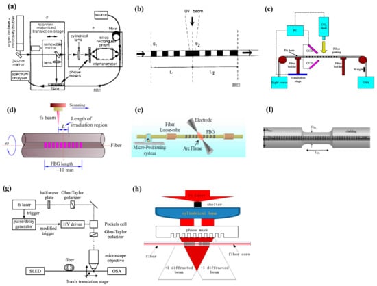 Unlike all the post-processing methods mentioned above, the infrared femtosecond (fs) laser writing methods have recently been proposed and demonstrated to fabricate PS-FBGs [16,17,18,19,20,21]. Of these, Burgmeier et al., had firstly reported and demonstrated a PS-FBG based on the point-by-point (or line-by-line) technique as shown in Figure 3g [16], where the FBG was point-by-point inscribed in a fiber by using a femtosecond laser while the phase-shift inserted into the FBG was realized just by setting an appropriate line gap at the required local position of the grating, i.e., the FBG’s fabrication and the phase-shift insertion are realized simultaneously without any post-processing operations. However, an extremely high precision for the fabrication setups and high quality for the used laser beam are strictly required, which would inevitably restrain this technique from the industry application for mass production. As an alternative, Du et al., have proposed and demonstrated a simple PS-FBG writing technique [19], shown in Figure 3h, where a uniform phase mask and an additional beam shelter (blocker) are specially utilized. During the fabrication, a central part of the fs laser beam is blocked by the shelter. As a result, there exists a blank (un-exposure) region in the central region of the FBG, which is equivalent to a phase-shift inserted in between two identical FBGs located on both sides of the blank region. However, such a newly produced phase-shift strictly depends on the length of the blank region formed in FBG; in order to precisely obtain the phase-shift, much more effort in the calibrations of the practically obtained phase-shift and optimal adjustments of the shelter, in both the length and position with a resolution of sub-micrometers, then becomes necessity.
