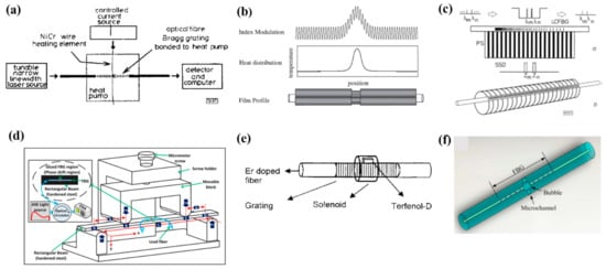 Fabrication methods for insertion of a temporal phase-shift in FBG. (a) NiCr wire heating method [23]. (b) Thin metal film heating method. Adapted with permission from ref. [27]. (c) Piezoelectric transducer method [28]. (d) Mechanical pressure method. Adapted with permission from ref. [34]. (e) Magnetostrictive transducer technique [35]. (f) Femtosecond laser-based microchannel method [37].