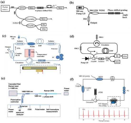 Lastly, Wu et al., have recently proposed and demonstrated a Q-switched EDF ring laser as shown in Figure 5f, where a PZT-based PS-FBG is inserted into the ring cavity and used as an electrical-optical switch. As a typical result, a pulse train with a repetition rate of 1 kHz, pulse width of 15.6 μs, and pulse energy of 1.16 μJ have been obtained under the pump power 90 mW [32].