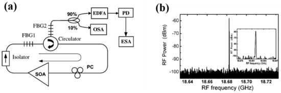 In general, a microwave or millimeter-wave signal can be generated in the optical domain based on an optical heterodyning method, in which two optical waves with different wavelengths beat at a photodetector [56]. To obtain a highly stable beat signal, the laser source should be either the single laser but having dual longitudinal modes or the two SLM lasers but operating at two different wavelengths, respectively. In 2006, Chen et al. [57] first proposed and demonstrated a novel approach for the generation of high-frequency microwave signals, shown in Figure 6a, where in combination with a regular FBG, a PS-FBG but with two ultranarrow transmission bands was used to ensure the fiber ring laser operating in SML but with dual-wavelengths. As a typical result, the microwave signal with frequency 18.68 GHz was successfully obtained at the photodetector, as shown in Figure 6b.