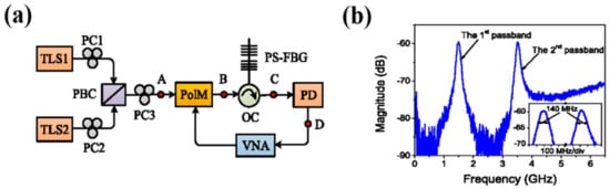On the other hand, the microwave signals can also be generated by using the external phase/amplitude modulation technique [56]. In 2012, by means of the phase-modulation technique in combination with a PS-FBG, Li et al., proposed and experimentally demonstrated a novel approach that enables the realization of a narrow band and frequency-tunable microwave photonic filter [61], where the PS-FBG was used to convert the phase-modulated signal to an intensity-modulated signal by filtering (removing) one sideband of the phase-modulated signals. By using the same approach and taking further advantage of two orthogonally polarized optical waves and a PS-FBG, the same group in [61] has demonstrated a new method enabling producing a tunable dual-passband microwave photonic filter (MPF), shown in Figure 7, where the PS-FBG shown in Figure 7a is operated in reflection rather than the transmission. As a result, a dual passband MPF with bandwidth 140 MHz and frequency tunable range of about 6 GHz for both the two passbands was successfully demonstrated, as shown in Figure 7b.