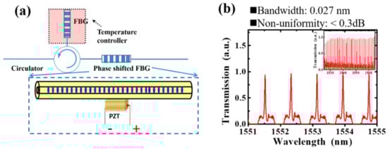 (a) The experimental configuration for the PS-FBG-based comb filter. (b) Transmission spectrum of the comb filter system shown in left side, where the inset shows the whole 51-channel spectrum. Adapted with permission from ref. [65]. © [2022] IEEE.