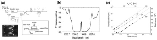 - LeBlanc, M.; Vohra, S.T.; Tsai, T.E.; Friebele, E.J. Transverse load sensing by use of pi-phase-shifted fiber Bragg gratings. Opt. Lett. 1999, 24, 1091–1093. [Google Scholar] [CrossRef]