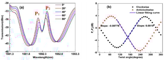 (a) Transmission spectra of the proposed PS-FBG under different torsion angles. (b) The relationship between the transmission difference P1 − P2 and the applied torsion. Adapted with permission from ref. [17]. © The Optical Society.