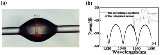 (a) Schematic diagram and (b) reflectance spectrum of the FBG-FP-based sensor for simultaneous measurement of three-parameter. Adapted with permission from ref. [95].