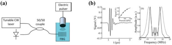 In addition to the sensing applications above, the PS-FBGs have also been explored to find applications in the measurement of the ultrasonic and magnetic field, etc. In 2011, Rosenthal et al., proposed and demonstrated a highly sensitive, yet compact, hydrophone, shown in Figure 14a, where a PS-FBG was used for measurement of a wideband ultrasonic field. The principle of this method lies in the fact that the measured ultrasonic filed could be equivalently expressed as a transverse pressure applied on the FBG, whereas the peak wavelength of the narrow notch resulted from the PS-FBG is strongly dependent on the transverse-load pressure [88,89,90]; thus, a change in such a peak wavelength can be used to measure ultrasound-induced pressure variations within the grating. Some of the measurement results are shown in Figure 14b. In contrast to standard fiber sensors, the high finesse of the notch, which is the reason for the sensor’s high sensitivity, is not associated with a long propagation length. As a typical result, a PS-FBG-based ultrasonic sensor with an effective length of 270 μm, a pressure sensitivity of 440 Pa, and an effective bandwidth of 10 MHz was successfully demonstrated. To further improve the stability and sensitivity of the ultrasonic sensing system, in 2015, Guo et al., proposed and demonstrated another PS-FBG-based ultrasonic sensor [98], where the sensing system was more robust and more stable since the wavelength (frequency) of the utilized laser was precisely locked to the notch wavelength of the utilized PS-FBG by using the Pound–Drever–Hall (PDH) technique. The proposed method enables considerably reducing the effect of laser intensity noise and thus enables high-sensitivity ultrasonic detection.