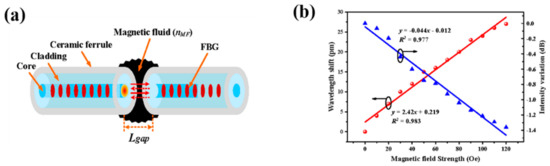 (a) Schematic diagram of the proposed magnetic field sensor. (b) Wavelength shift and intensity variation of the transmission peak against magnetic field strength. Adapted with permission from ref. [99]. © [2022] IEEE.