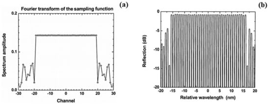 In 2003, the author Li et al., firstly proposed and systematically demonstrated the phase-only sampling method to produce a multichannel FBG [107], where a discrete phase-only function including either the binary-level one (also called the Dammann phase-only sampling function) or the multi-level one was particularly selected and optimized by using the simulated annealing algorithm. Figure 16 shows the design results for a 39-channel FBG, where the Fourier spectrum of the optimized phase-only function and the calculated reflection spectrum of the corresponding 39-channel FBG are shown in Figure 16a,b, respectively. From these two figures, it can be seen that the channel uniformities are strongly related to the Fourier transform of the phase-only sampling function. The channel nonuniformity is less than 2%, and in-band energy efficiency is about 80%, which in turn means that nearly 20% of the out-of-band channels are inevitably generated; thus, such a kind of multichannel FBG can be used only to those applications where the out-of-band channels can be allowed to exist.