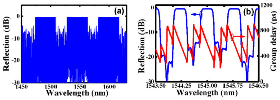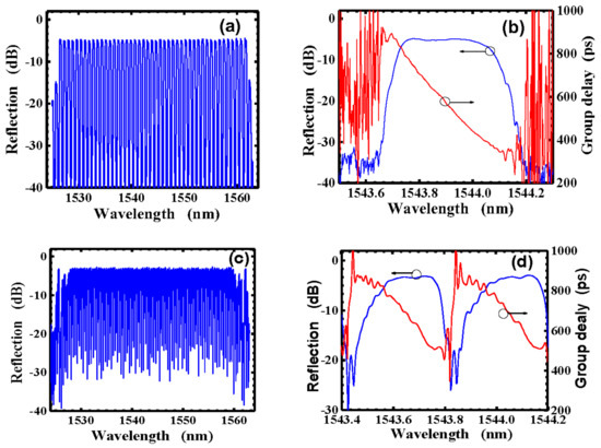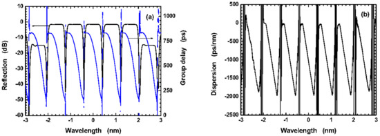 - Dai, Y.; Chen, X.; Sun, J.; Xie, S. Wideband multichannel dispersion compensation based on a strongly chirped sampled Bragg grating and phase shifts. Opt. Lett. 2006, 31, 311–313. [Google Scholar] [CrossRef] [PubMed]