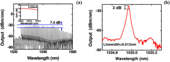 As a complement to the above fiber lasers, Chen et al. [51] demonstrated another SLM fiber ring laser, as shown in Figure 5d, where the conventional PS-FBG was replaced by an equivalent PS-FBG previously developed by the same authors in [39]. By using the same FBG but with two un-equalized phase-shifts, Sun et al., further demonstrated a dual-wavelength EDF fiber laser [52], where the mode competition between the generated two lasing lines can be well restrained due to the few overlaps of their power spectra.