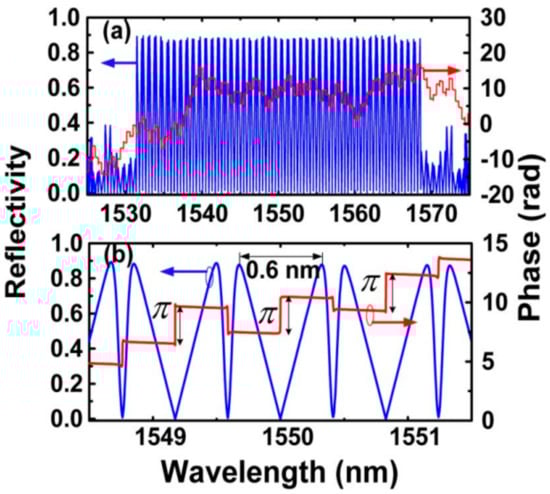 FBG refers to a fiber grating where the period of the index modulation is nearly the same order as the light wavelength. As a result, the mode-coupling resonantly occurs only between the forward-propagating core mode and the backward-propagating core mode, behaving exactly like a bulk Bragg grating, which makes the FBG a good candidate as a narrow band-pass filter (with a bandwidth ~0.1 nm) but operating in the reflection [3]. Nowadays, FBGs have been widely used as fiber sensors, wavelength division multiplexer (WDM) demultiplexers, add/drop filters, and dispersion compensators, etc. [2,3,4,5,6]. On the other hand, it is rather difficult or even impossible to flexibly and precisely control the bandwidth and the spectral profile of the ordinary FBG, especially for the ones with either an ultra-narrow bandwidth or a triangular envelop, or a rectangular-type envelop, or a high channel count in spectrum, etc., which, however, is essential to the FBG-based devices whenever they are practically used in the fields of fiber communications, optical information processing, and fiber sensing, etc. Phase-inserted FBGs are excellent candidates that enable overcoming all the issues mentioned above.
