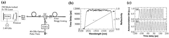 - Longhi, S.; Marano, M.; Laporta, P.; Svelto, O.; Belmonte, M.; Agogliati, B.; Arcangeli, L.; Pruneri, V.; Zervas, M.N.; Ibsen, M. 40-GHz pulse-train generation at 1.5 μm with a chirped fiber grating as a frequency multiplier. Opt. Lett. 2000, 25, 1481–1483. [Google Scholar] [CrossRef]