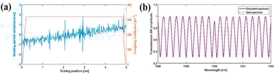 where Re represents the real part of a complex number. z represents the position in the grating, represents the maximum index modulation of the grating, and Λ0 and represent the central period and local phase of the grating, respectively. Note that for convenience, the DC part of the index-modulation has been ignored in Equation (1).
