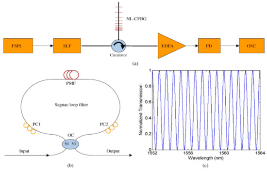 In 2011, the author Li’s group experimentally demonstrated a 51-channel comb filter [65], which was realized by using a PZT-induced, phase-shifted multichannel FBG, as shown in Figure 8, where Figure 8a shows the experimental setup for generation of the comb filter, whereas Figure 8b shows the measured transmission spectrum of the comb filter. A multichannel filter with a channel-count up to 51, each with a bandwidth ~27 pm and non-uniformity ~0.3 dB in channel amplitude was successfully obtained. By using the same method, the same authors successfully introduced one, two, and three phase-shifts into a 51-channel, linearly chirped FBG and as a result, three comb filters with channel counts of 51, 102, and 153 were obtained, respectively [66].