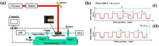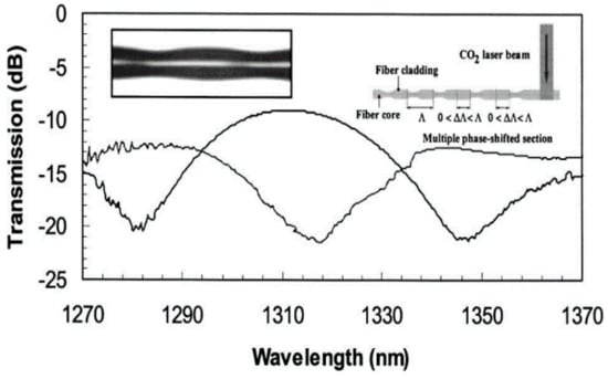 Instead of the UV laser, the CO2 laser, the femtosecond laser, and the arc-discharge have also been used to form and insert a post-processing phase-shift into a fabricated FBG; typical examples of them are shown in Figure 3c–e, respectively, where the principles to produce the phase-shift are almost the same as those of the post-UV irradiation, i.e., the phase-shifts are produced due to a change in the effective index induced in local region of the FBG [11,12,13]. The magnitude of the inserted phase-shift can be changed by adjusting the width of the irradiation region and the irradiation flux as well.
