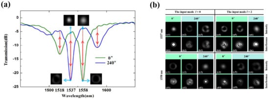 - Wu, X.; Gao, S.; Tu, J.; Shen, L.; Hao, C.; Zhang, B.; Feng, Y.; Zhou, J.; Chen, S.; Liu, W.; et al. Multiple orbital angular momentum mode switching at multi-wavelength in few-mode fibers. Opt. Exp. 2020, 28, 36084–36094. [Google Scholar] [CrossRef] [PubMed]