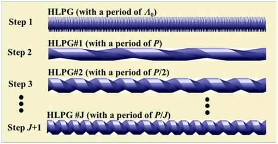 where is the phase of the coefficient . To take into careful account Equation (5), one can easily find that , i.e., the phase-only sampled HLPG, can be equivalently regarded as a linear superposition of an infinite number of the gratings (channels), and each of these gratings has its own amplitude of and its own period of in terms of different orders of the Fourier series m. The channel spacing (in unit of the wave number) among these individual gratings remains a constant of 1/P (corresponding to a wavelength spacing of , where and are the central period and resonant wavelength of the seed FBG, respectively). Therefore, as long as the channel spacing adopted is larger than the bandwidth of the seed FBG itself, multiple channels without any inter-channel interferences could be obtained by using the sampling method. In most of the application cases, especially for the multichannel FBG used in WDM system, high channel uniformities (including the uniformities in channel bandwidth, channel amplitude, and channel spacing) and high channel count are strictly required, which in turn means that, for a phase-only sampled FBG with a required channel of 2M + 1, the sampling function needs to be optimized such that all the in-band Fourier coefficients remain a constant and should be close to as possible [107]. In general, the cost function enabling satisfying the above design criterions for the function shown in Equation (4) can be expressed by [114]