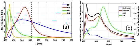 Studies have shown that the aspect ratio of a disk resonator influence not only the response of the multipoles but also the forward and the backward scattering properties [32,33]. Therefore, in order to tailor the backward scattering from an array of disk resonators it is essential to study the effect of radius and height of a disk resonator on the scattering properties. Normalized SCS of TiO2 disk resonators as a function of the disk radius and height is presented in Figure 2. With the increasing radius of the disk, the multipole peaks broaden and red-shift (Figure 2a). Increasing the dimension of a resonator results in a larger fraction of the fields confined within the resonator, thus red-shifting the resonant wavelength [34]. Though the red-shift and broadening of the multipole resonances are also observed as a function of the height of a disk (Figure 2b), quantitatively, the SCS increases with the increasing height, unlike the previous case (radius dependent SCS). It should be noted that the geometrical cross-section/normalization factor (πr2) depends on the radii, but not on the height of the disk resonator. The higher order modes (EQ and MQ) occur for larger radii (>125 nm) at shorter wavelengths and their resonances are narrow compared to the lower order modes. Specifically, the modes in the range of 320–400 nm (UV region) can also get absorbed within the TiO2 resonators. The multipole decomposition shows that the ED and the MD resonances are in the same spectral region for the disks of radius above 60 nm. Therefore, one can expect Kerker conditions to be satisfied within this spectral region for these disks, leading to an efficient forward or backward scattering.