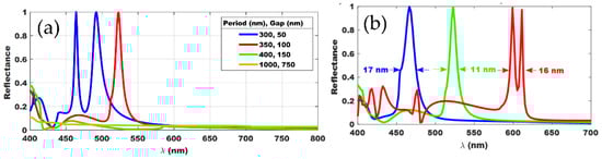 (a) Variation in the reflectance from a TiO2 disk resonator (radius = 200 nm, height = 125 nm) array with changing period (or with changing gap between the neighboring resonators). (b) Red (R), green (G) and blue (B) reflectance profiles generated in a TiO2 disk resonator array. Periodicities chosen to generate R, G, B reflectance colors were 400, 350 and 300 nm, respectively and the corresponding disk radii were 190, 125 and 95 nm. The reflectance peaks are narrow, resulting in a minimum penalty in the transmittance.