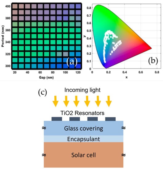 (a) Color palette generated from TiO2 disk resonators (embedded in silica layer) of height 200 nm for different combinations of array period and gaps. (b) Corresponding positions of the colors on the CIE 1931 chromaticity diagram. (c) A schematic describing TiO2 resonator array on top of encapsulated of a solar cell and embedded within a glass covering. Note that, in the simulations, the refractive of the medium around the TiO2 resonators is assumed to be the same as that of silica layer (n = 1.46), as the refractive indices of glass covering and the encapsulant are similar. The light is the incident form of the silica glass (n = 1.46) medium.