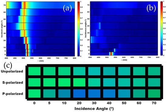 We find that the reflected colors are sensitive to the polarization of the incoming light that is an incident that is off-normal or at an angle. For an incident of p-polarized light, the resonator array (r = 125 nm, h = 200 nm and period = 350 nm) does not produce a reflectance peak for any incidence angles larger than 10º, as shown in Figure 5a. Whereas, for the case of s-polarized light, the reflectance peak not only exists for all the incidence angles up to 70° (Figure 5b), but also the spectral peak position blue shifts only by about 30 nm. A similar observation has been made in the case of TiO2 metasurfaces wherein the reflectance spectra is highly angle-sensitive for an incident p-polarized light and the reflected intensity drastically reduces for the off-normal angle of incidences [16]. This suggests that the reflected color is mostly s-polarized light for the off-normal configurations. However, in this scenario the transmitted p-polarized light can be absorbed by the solar cell.