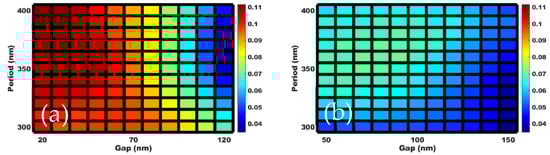 The calculated FoMPenalty on the loss of short-circuit current due to the color layer above a solar cell for varying period and gap of the TiO2 resonator array, when (a) the resonator array is placed on a silica substrate and (b) the resonator array is embedded inside a silica medium.