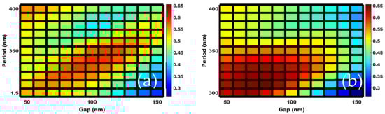 The calculated FoM_Total on UV blocking due to the color layer above a solar cell for a varying period and gap of the TiO2 resonator array, when (a) the resonator array is placed on a silica substrate and (b) the resonator array is embedded inside a silica medium.