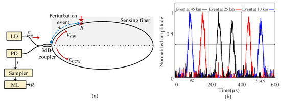 As an illustration of (4), consider an SI of length 106.245 km. The loop’s total propagation delay (T) is 520.9 s assuming the fiber has a refractive index of 1.47. When there is no event, the CW and CCW signals undergo no phase shift, and the output of the PD is a DC signal. If an event occurs at a particular moment at a distance of 10 km from the coupler, a phase change will occur to the CW and CCW signals during this specific moment. The CCW signal will reach the PD after s, while the CW will reach the PD at s. According to (4), this phase change will cause a change in the signal intensity at the PD output at two different time moments ( s and s). Therefore, the signal intensity at the PD output shows two pulses, as illustrated in Figure 1b. Note that the peaks of the pulses are shown at s and s because the event signal (Gaussian pulse) has a particular duration, with a peak at 43 s. If the event position changes, the two pulses will appear at different positions, as indicated in Figure 1b for events at 25 km and 45 km. Therefore, the output signal of the PD can be used as a feature for the event position during ML training.