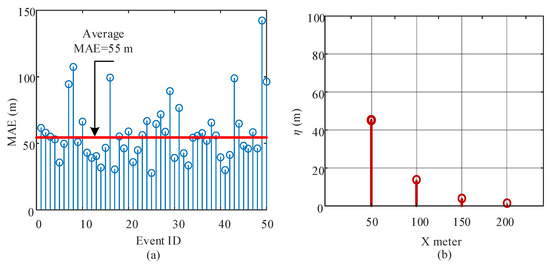 Figure 3a shows the performance of the ML in terms of MAE. In the figure, each of the 50 test events is represented by an identification (ID) number. The results show that the maximum and minimum MAE are 148 m and 28 m, respectively. The average MAE over the 50 events is 55 m. The value of is illustrated in Figure 3b. Almost half of the realizations have a position error > 50 m. The test realizations with a position prediction error > 100 m represent 14.2% of the total number (i.e., 1500). The value of decreases to 0.7% for position prediction error > 200 m.