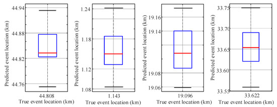 To look deeper at the MAE of each test location, a boxplot is used for four arbitrary test events, as indicated in Figure 4. A boxplot is a tool that represents the data as a box where the center of the box is the median, whereas the box’s bottom edge indicates the 25th percentile and the box’s top edge indicates the 75th percentile. From Figure 4, we notice that the box’s height is less than 100 m, meaning most of the predicted event’s values (30 realizations per event) are close to the median. The standard deviations for the four arbitrary positions in Figure 4 are 41.9 m, 57.7 m, 32.9 m, and 26.9 m. This means, for example, the standard deviation for the 30 prediction values of the position 44.808 km is 41.9 m. The maximum standard deviation for these arbitrary positions is 57.7 m, which reflects the repeatability goodness of the algorithm.
