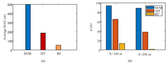 Performance comparison of SVM, DT and RF ML algorithms: (a) Average MAE, and (b) value of with prediction error > X m. The y-axis in Figure 5a is limited to 500 m for better visualization of the results.